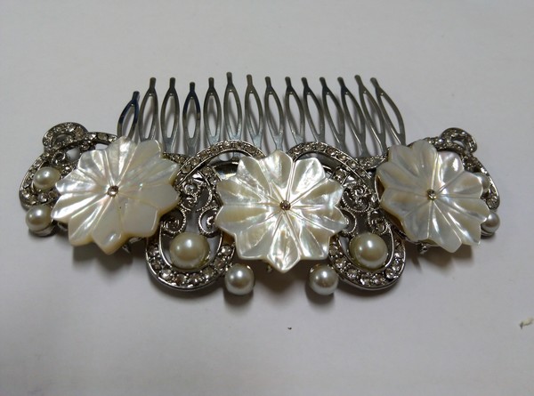 Peinecillos nácar Inmaculada con perlas. Metal en color plata con pedrería cristal. El tamaño de esta pieza es grande, mide aproximadamente 14x4cm.