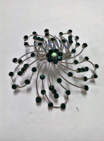 Peinecillos Gala con pedrería verde oscuro. Con forma circular en metal plateado salteado por la pedrería, en el pelo se aprecia la forma de una flor.