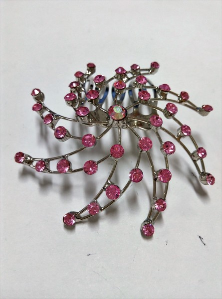 Peinecillos Violeta. Color rosa claro de metal plateado adornado con pedrería rosa claro y con radios en pico, forman un circulo en su conjunto.