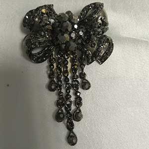 Broche negro azabache, sobre fondo plata envejecida en bisutería. Con forma de lazo con cadenas móviles colgando del lazo. Broche plateado.